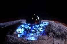 In the Gaia island, a single, reflecting sphere rests on the CRT surface, which is covered by sea salt mixed with crystals of silicon, gallium, and other materials used to produce the electronic integrated circuit chips contained within the video synthesizing and display equipment. Viewers can not only observe themselves viewing the work, their focus will also be attracted to the kinetic visual motion displayed at the meeting edge of the reflecting sphere and the glass surface.