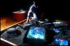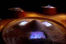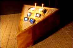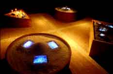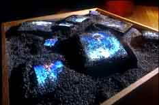 A series of images is presented on four islands, each ranging from one to three meters in width and one meter high, and constructed of Japanese maple wood, filled with natural materials obtained near Nagoya (river pebbles, beach sand, sea salt), with multiple CRT video monitors buried in the materials. The four islands represent the classical elementals: Water, Earth, Fire, and Gaia.